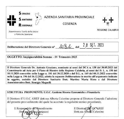 «E’ arrivata, indirettamente, con la deliberazione n. 2082 del 28.settembre 2023, adottata dal Direttore Generale dell’ASP di Cosenza, con la quale è stata dichiarata l’impignorabilità di determinate somme, sottoponendo a vincolo gli importi relativi alle entrate previste per il IV trimestre 2023, per un importo complessivo di euro 287.840.349,75. E perché è stato necessario ricorrere alla impignorabilità delle somme? E’ stato necessario “al fine di garantire la continuità assistenziale”. E che cosa ha messo in pericolo la garanzia circa la continuità assistenziale? “L’elevato contenzioso pendente relativo a risarcimento danni derivanti da colpa professionale”: così è, testualmente, scritto, nella richiamata deliberazione.