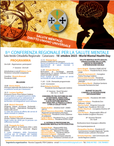 CATANZARO Martedì 10 ottobre alle 9,30, in coincidenza con il word mental healt day, nella sala verde della Cittadella, si svolgerà la seconda Conferenza Regionale sulla salute mentale.
