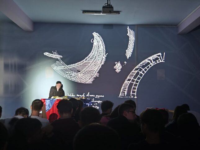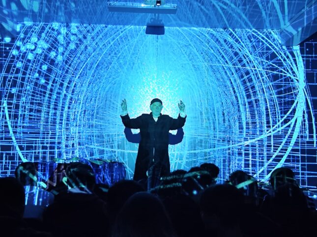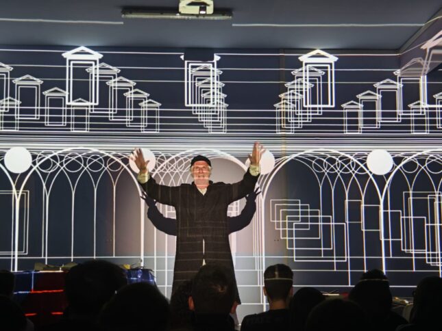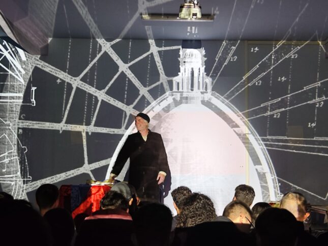 Grande entusiasmo in sala, con lo stupore e il senso della meraviglia sul viso dei ragazzi, ad ascoltare le parole portate con forza e grande stile, sul palco, da Roberto Visconti, circondato alle spalle da un fondale fatto di magico gioco e incrocio di linee e di luci, di musiche sofisticate e riuscitissime, in un insieme vertiginoso a disegnare prospettive, una prospettiva nuova dell’arte e di vita, in linea con l’irregolare stravaganza di Brunelleschi, costruita e consolidata nell’idea che “le idee siano degli uomini, per gli uomini controversi”.
