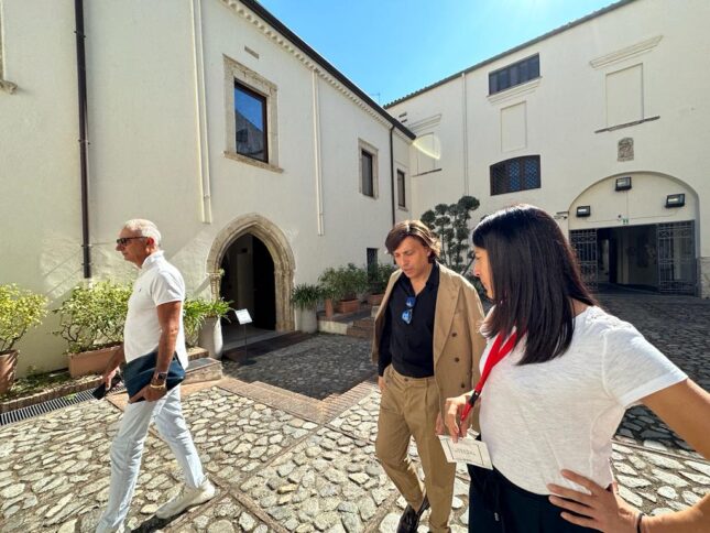 CORIGLIANO ROSSANO Dal Codex Purpureus Rossanensis, il più antico manoscritto onciale greco (del V – VII secolo) sulla vita di Cristo, l’unico ad essere musealizzato ed al cui interno sono presenti la più antica rappresentazione de L’Ultima Cena, più attendibile di quella ben più famosa di Leonardo da Vinci, il più antico notturno della storia dell’arte cristiana, il più antico ciclo di miniature sulla vita di Cristo rimasto in un manoscritto greco, la più antiche rappresentazioni di un’aula di tribunale e la più antica rappresentazione dei Quattro Evangelisti; a San Nilo, ultimo santo prima dello Scisma tra Oriente ed Occidente; da Giovanbattista Palatino, il calligrafo più celebre del Rinascimento, autore del manuale di scrittura più stampato della storia al quale è dedicato uno dei caratteri più usati al mondo, il Palatino appunto; da Papa Urbano VII protagonista del pontificato più breve della storia della Chiesa a l’Abbazia di Santa Maria del Patire, lo scriptorium più importante e ricco del periodo normanno. A rilanciare il valore universale non solo in termini artistici e culturali ma anche turistici e di marketing territoriale di alcuni dei diversi Marcatori Identitari Distintivi (MID), tra i 100 censiti nella proposta di mappatura ufficiale consegnata nei mesi scorsi alla Regione Calabria, icone dell’importante patrimonio storico, culturale, architettonico di Corigliano-Rossano, è stato stamani (domenica 8 ottobre) il Commissario della Fondazione Calabria Film Commission Anton Giulio Grande. Ad accompagnarlo in visita per i corsi e tra i celebri, numerosi palazzi gentilizi della Città d’Arte sono stati Lenin Montesanto, Program Manager della Cabina di Regia regionale sui MID e Nicola Cherubini, il cui omonimo Palazzo nel cuore del Centro Storico di Rossano, nella rete delle dimore storiche italiane (ADSI), è diventato negli ultimi anni una delle espressioni più ricercate dal turismo internazionale di lusso.