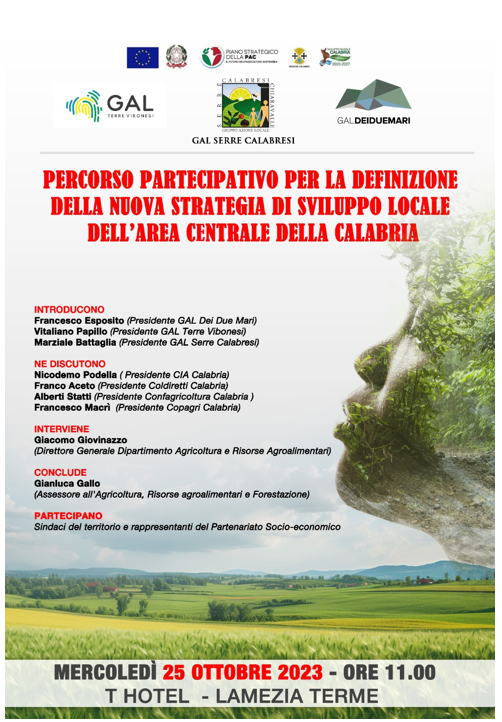 LAMEZIA TERME Mercoledì 25 Ottobre, alle ore 11:00, presso il T Hotel di Lamezia Terme avrà luogo un incontro in cui il GAL dei Due Mari, il GAL Terre Vibonesi e il GAL Serre Calabresi dialogheranno con i rappresentanti delle associazioni di categoria, i sindaci del territorio e i rappresentanti del partenariato socio-economico, per illustrare la nuova Strategia di sviluppo locale, programmazione che riguarderà il periodo 2023-2027. Prenderanno parte all’incontro oltre ai tre presidenti Francesco Esposito, Marziale Battaglia e Vitaliano Papillo, Giacomo Giovinazzo, Direttore Generale Dipartimento Agricoltura e Risorse Agroalimentari e Gianluca Gallo, Assessore all’Agricoltura, Risorse agroalimentari e Forestazione della Regione Calabria.
