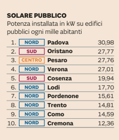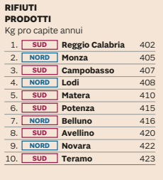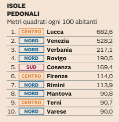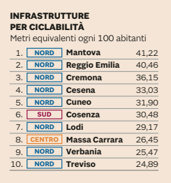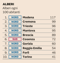 Al settimo posto Cosenza, prima città del Sud (anche se perde due posizioni rispetto allo scorso anno), alle sue spalle Cagliari 16esima e Oristano 22esima. Roma è solo 89esima, fanalino di coda per Caltanissetta (103esima), Catania e Palermo (entrambe 105esima). Oscillazione in negativo per Milano al 42esimo posto (la scorsa edizione era scesa al 38esimo posto), per Firenze che slitta al 53esima posto e Genova al 58esimo posto. Regina green per performance ambientali è Trento, seconda lo scorso anno e già vincitrice due e tre edizioni fa.