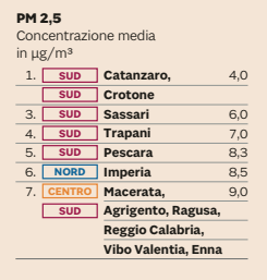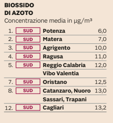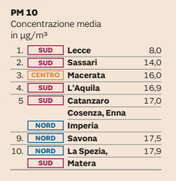I centri calabresi offrono buone performance anche nell’inquinamento atmosferico. Basse concentrazioni di biossido d’azoto per Reggio Calabria e Vibo Valentia (quinte) e Catanzaro (ottava). Buoni i dati anche nella concentrazione di PM10 per Catanzaro e Cosenza (quinte). Conferma anche sulla concentrazione di PM 2,5: Cosenza e Crotone sono prime, Reggio Calabria e Vibo Valentia sono settime.