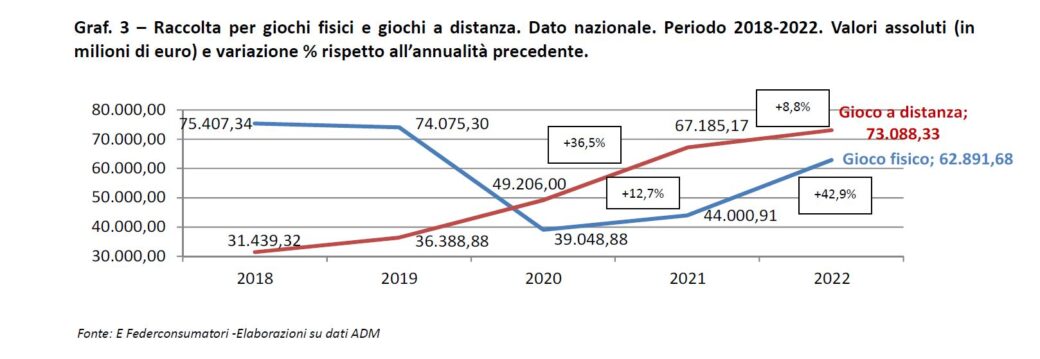 Secondo “Il libro nero dell’azzardo”, il rapporto curato da Cgil, Federconsumatori con la collaborazione della Fondazione Isscon (Istituto studi sul consumo), il gioco online ha superato nel 2022 i 73 miliardi di euro, non solo confermando il sorpasso rispetto alle scommesse dalle postazioni fisse ma raddoppiando nei numeri rispetto al 2019.