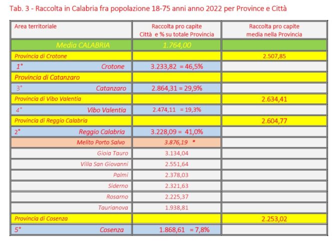 Stando al report, in un anno sono stati raccolti oltre 3,2 miliardi (per l’esattezza 3.247,14 milioni). Mentre la raccolta pro capite è stata pari a 1.764 euro contro la media nazionale di 1.242 euro, del Mezzogiorno e Isole di 1.710 euro, del Centro di 1.206 euro e del Nord di 884 euro.
