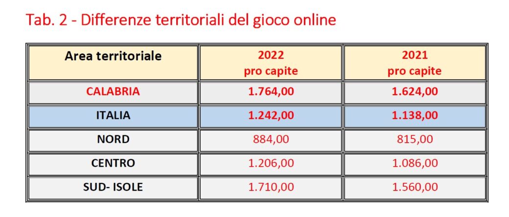 I dati che emergono dal rapporto elaborato da Federconsumatori Calabria indicano numeri davvero preoccupanti per la Calabria. Nonostante il basso numero di residenti e un Pil pro capite che pone la regione agli ultimi posti, la Calabria risulta al decimo posto per dimensione di somme scommesse.