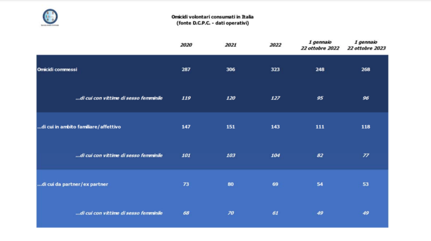 Volgendo lo sguardo infine agli omicidi commessi ai danni di donne, emerge una certa recrudescenza. Su 268 omicidi commessi in Italia da gennaio al 22 ottobre scorso, 96 vittime sono donne di cui 77 uccise in ambito familiare/affettivo. Quarantanove di queste hanno trovato la morte per mano del partner/ex partner. Nel medesimo periodo del 2022, a cadere vittima di assassini erano state 95 donne. Segnando un incremento dell’1,05%.