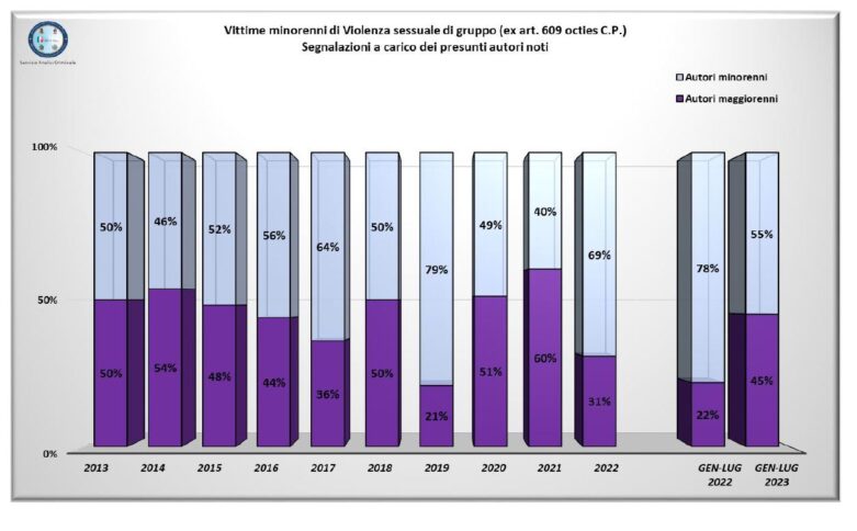 E poi ci sono le violenze sessuali di gruppo le cui vittime per oltre un terzo sono minorenni. Allargando l’età dell’indagine, redatta dagli analisti del Viminale, emerge come questi episodi di violenza particolarmente efferata colpiscano ragazze giovanissime: 6 su 10 hanno meno di 25 anni. Così come colpisce l’età degli aggressori: nel 2022 ad esempio quasi 7 su dieci erano minorenni mentre nei primi sette mesi di quest’anno il branco era composto per oltre la metà da ragazzini (55%). Frutto amaro di un’educazione sessuale votata per lo più a considerare la donna come oggetto.