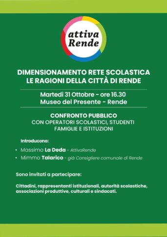 RENDE L’associazione AttivaRende ha promosso una discussione pubblica sul tema: “Dimensionamento rete scolastica. Le ragioni della città di Rende”