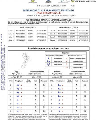 CATANZARO Diramata l’allerta gialla, per oggi 3 e domani 4 novembre, su tutta la Calabria. A disporla la Protezione civile della Calabria che segnala possibili temporali e venti forti soprattutto lungo le coste tirreniche. Condizioni meteo avverse che potrebbero comportare, secondo il dispaccio diramato dalla Prociv calabrese, precipitazioni sparse anche a carattere di temporale. Previsti anche venti forti con raffiche di burrasca meridionale e mari agitati.