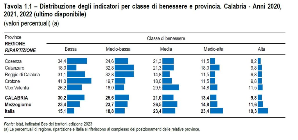 Collocando le province italiane in cinque classi di benessere relativo (bassa, medio-bassa, media, medio-alta e alta) sul complesso degli indicatori disponibili per l’ultimo periodo di riferimento (2020-2022), il 30,2% delle misure colloca le province calabresi nella classe di benessere più bassa e il 55,8% delle misure nelle classi medio-bassa e bassa (la media delle province del Mezzogiorno è rispettivamente 23,4 e 47,1%).