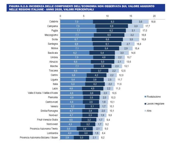 Stando ai dati raccolti nella Relazione, la Calabria risulta essere la regione in Italia in cui il peso dell’economia non osservata è massimo. Gli analisti del Mef stimano sia pari al 18,8% del valore aggiunto prodotto. Un dato record più alto della media nazionale che si ferma all’11,6% e dello stesso Mezzogiorno (16,8%) e decisamente lontano dal tasso registrato nella Provincia Autonoma di Bolzano (8,2%) o della Lombardia (8,4%), le aree più virtuose del Paese.