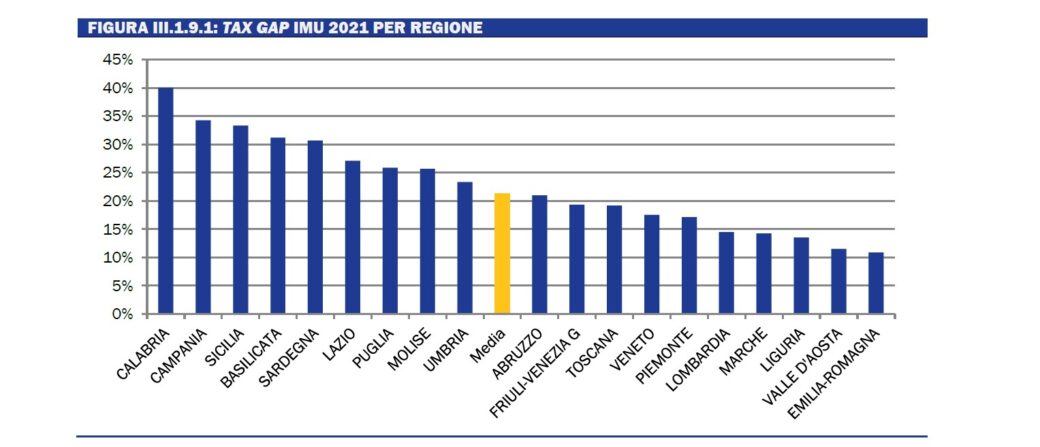 Ancora più alto il tasso di propensione ad evadere i tributi locali. Stando all’elaborazione relative al 2021, la percentuale di Imu evasa in Calabria è pari al 40%: il dato in assoluto più elevato in Italia. Come anche il tax gap sulle addizionali Irpef regionali e comunali in Calabria supera il 60%.