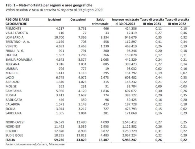 Allargando la forbice con le regioni più ricche del Paese dove ad esempio in Valle d’Aosta il numero delle imprese registrate è cresciuto dello 0,46%, mentre in Trentino quel tasso di crescita è stato pari allo 0,34% ed in Lombardia allo 0,32%.