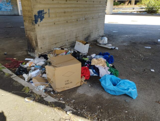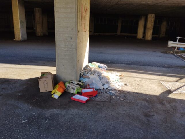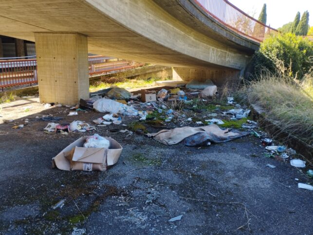 Sopra i treni (pochi), scendendo verso l’area parcheggio cumuli di rifiuti abbandonati e “postazioni letto” per clochard