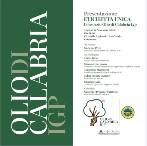 CATANZARO Domani mattina, martedì 14 novembre, alle ore 11,30, conferenza stampa del Consorzio Olio di Calabria Igp, nella sala Verde della Cittadella regionale a Catanzaro, per la presentazione ufficiale dell’etichetta unica per l’olio calabrese.