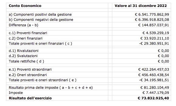 Nel progetto di legge della Giunta si specifica che «il totale delle entrate accertate nell’esercizio finanziario 2022 per la competenza propria dell’esercizio stesso è stabilito in euro 7.544.457.880,26… Il totale delle spese impegnate nell’esercizio finanziario 2022 per la competenza propria dell’esercizio stesso è stabilito in euro 7.425.488.552,46…». I residui attivi (entrate accertate ma ancora non riscosse) al 31 dicembre 2022 ammontano a oltre 5,4 miliardi, i residui passivi (spese impegnate ma ancora non pagate) ammontano a oltre 4,5 miliardi. Ilr insultato di amministrazione al 31 dicembre è fissato in euro 1.646.867.927,80. Il risultato economico dell’esercizio 2022 è stabilito in euro 73.832.925,40.