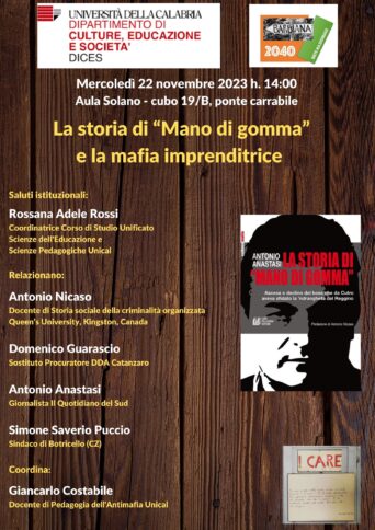 RENDE Proseguono le iniziative dell’insegnamento universitario di Pedagogia dell’Antimafia attivo presso il dipartimento di Culture, Educazione e Società dell’Università della Calabria. Domani, mercoledì 22 novembre, gli studenti e le studentesse di Scienze dell’Educazione dell’Unical si confronteranno con il tema della mafia imprenditrice attraverso i contenuti del libro “La storia di Mano di gomma”, biografia non autorizzata del potere criminale di Nicolino Grande Aracri, scritto dal giornalista Antonio Anastasi. L’iniziativa si terrà alle 14:00 presso l’aula Solano, cubo 19/B – ponte carrabile, e sarà introdotta dai saluti di Rossana Adele Rossi, coordinatrice del corso di studio unificato in Scienze dell’Educazione e Scienze Pedagogiche dell’ateneo di Arcavacata. A relazionare sul tema, saranno, oltre ad Anastasi, Antonio Nicaso, docente di Storia sociale della criminalità organizzata presso la Queen’s University di Kingston, Canada, Domenico Guarascio, sostituto procuratore della Direzione Distrettuale Antimafia di Catanzaro, e Simone Saverio Puccio, sindaco di Botricello. A coordinare la tavola rotonda, Giancarlo Costabile, docente di Pedagogia dell’antimafia presso il DiCES Unical. Il seminario è patrocinato da Barbiana 2040, rete nazionale di scuole che attualizzano la metodologia di don Lorenzo Milani e della Scuola di Barbiana.
