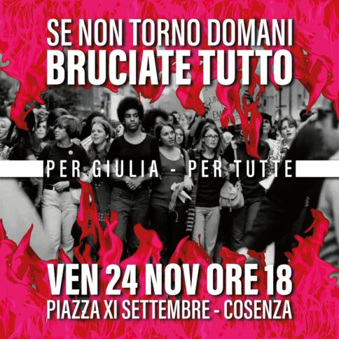 COSENZA «Giulia Cecchettin è la 105esima vittima di femminicidio in Italia dall’inizio del 2023. Siamo stanche e arrabbiate di dover vivere in un costante stato d’allerta, di doverci proteggere dalla violenza di uomini che non sono malati, ma sono i figli di un sistema educativo e valoriale in cui noi veniamo percepite come oggetti di loro proprietà. Siamo stanche di dover fare attenzione quando torniamo a casa, siamo stanche di temere per la nostra vita se prendiamo un treno di notte, non vogliamo più dover pensare a come vestirci per evitare di essere molestate per strada». È quanto affermano in una nota le organizzatrici dell’evento dal titolo “Se non torno domani bruciate tutto – Per Giulia e per tutte” che si terrà a Cosenza il prossimo 24 novembre alle 18 in piazza XI settembre.