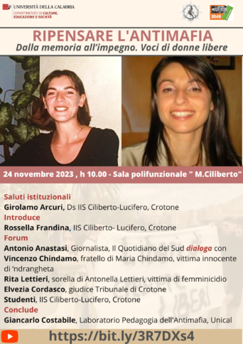 CROTONE Riparte il percorso di studio “Ripensare l’Antimafia” organizzato, nell’ambito del progetto nazionale Barbiana 2040 (rete di scuole che attualizza la metodologia didattica di don Milani), dal corso universitario di Pedagogia dell’Antimafia, attivo presso il Dipartimento di Culture, Educazione e Società dell’Università della Calabria, e dall’Istituto Ciliberto di Crotone. “Dalla memoria all’impegno. Voci di donne libere” è il tema scelto per aprire questo nuovo ciclo seminariale, giunto ormai al quarto anno di attività, per investigare nuovi paradigmi pedagogici capaci di costruire, coniugando memoria, impegno e riscatto, efficaci linguaggi di didattica del cambiamento sociale. L’iniziativa, che si terrà domani, venerdì 24 novembre, alle 10.00 presso la Sala Polifunzionale della scuola crotonese, sarà aperta dai saluti istituzionali di Girolamo Arcuri, Dirigente Scolastico dell’Istituto Ciliberto di Crotone, e dall’introduzione di Rossella Frandina, docente di Lettere del Ciliberto. Il programma prevede il dialogo tra il giornalista del Quotidiano del Sud, Antonio Anastasi e Vincenzo Chindamo, fratello di Maria, vittima innocente di ‘ndrangheta, Elvezia Cordasco, giudice presso il Tribunale di Crotone, Rita Lettieri, sorella di Antonella Lettieri, vittima di femminicidio e gli studenti e le studentesse del Ciliberto. A concludere i lavori sarà Giancarlo Costabile, docente di Pedagogia dell’Antimafia all’UniCal. Fare memoria, attraverso il racconto di storie come quella di Maria Chindamo significa costruire resistenza culturale attraverso l’impegno civile, significa fare pratica di democrazia attraverso quelle forme di libertà che diventano un dovere di testimonianza. «Senza memoria – dicono Frandina e Costabile – non c’è responsabilità e senza comportamenti responsabili non può esistere alcuna società democratica. La lotta alle mafie è difesa dei diritti e promozione di cittadinanza attiva finalizzata alla costruzione di un cambiamento sociale possibile». Ecco perché la pedagogia della memoria, in questa direzione, è uno strumento fondamentale per rendere prassica l’educazione a quella consapevolezza sociale grazie alla quale i cittadini diventano capaci di rivendicare diritti e dignità.