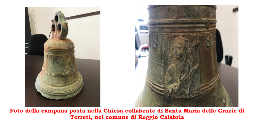 REGGIO CALABRIA Questa mattina, presso il Museo Diocesano “Monsignor Aurelio Sorrentino”, ubicato nel complesso architettonico dell’Arcivescovado, alla presenza di Sua Eccellenza Arcivescovo Fortunato Morrone, Arcivescovo Metropolita di Reggio Calabria – Bova e Presidente della Conferenza Episcopale Calabra, il Capitano Giacomo Geloso, Comandante del Nucleo Carabinieri Tutela Patrimonio Culturale di Cosenza ; il Colonnello Cesario Totaro, Comandante del Comando Provinciale Carabinieri di Reggio Calabria; il Capitano Renato Puglisi, Comandante della Compagnia Carabinieri di Reggio Calabria e il Tenente Pierantonio Tarantino, Comandante del Nucleo Operativo Ecologico di Reggio Calabria, hanno restituito tre campane in bronzo, rispettivamente del cinquecento, seicento ed ottocento, tutte provenienti da luoghi di culto ubicati nella Città di Reggio Calabria, andate disperse a seguito del rovinoso sisma del 1908 che interessò le città di Reggio Calabria e di Messina.