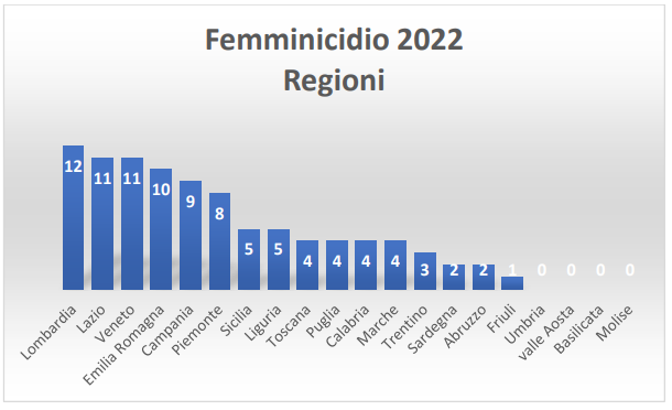 I femminicidi si sono verificati in: Lombardia 12; Lazio 11; Veneto 11; Emilia Romagna 10; Campania 9; Piemonte 8; Sicilia 5; Liguria 5; Toscana 4; Puglia 4; Calabria 4; Marche 4; Trentino Alto Adige 3; Sardegna 2, Abruzzo 2; Friuli 1.