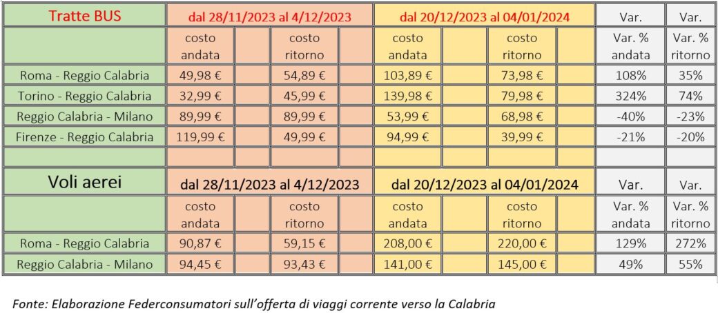 In termini percentuali significano rincari del prezzo dei voli in quelle due date del +129% per l’andata e +272% per il ritorno. Tali aumenti si aggiungono ai sovrapprezzi per chi decide di viaggiare in treno considerato che sulla tratta Roma-Reggio Calabria si arriva ad +84% per l’andata e +191% per il ritorno.