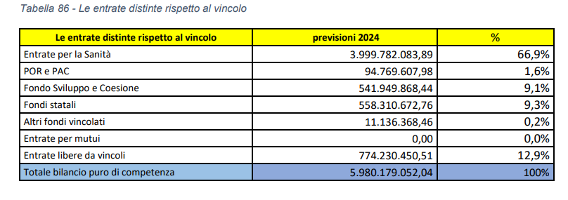 Secondo la Giunta regionale «per avere un quadro generale delle risorse disponibili, nonché un’idea sulle caratteristiche e peculiarità del bilancio regionale, si può prendere tranquillamente a riferimento la previsione attuale in termini di competenza riferita all’annualità 2024». Ed emerge – prosegue il Documento di Economia e Finanza della Regione – che «gran parte delle entrate di bilancio, complessivamente pari a circa 5,98 miliardi di euro, al netto delle partite di giro e dei saldi vincolati, sia costituita da risorse assegnate dallo Stato o dall’Ue con vincolo di destinazione (87,1%), mentre solo il 12,9% circa delle stesse è soggetto alle scelte discrezionali da parte della Giunta e del Consiglio della Regione. Più in dettaglio, le entrate regionali, al netto delle risorse per la Sanità (66,9%), su base annua sono costituite in gran parte dalle risorse comunitarie, dal Piano di Azione e Coesione, dal Fondo Sviluppo e Coesione, nonché da ulteriori fondi di natura vincolata assegnati a vario titolo dallo Stato o da altri soggetti. Tali risorse sono utilizzabili esclusivamente per le finalità per cui sono state assegnate o per quelle concordate con il livello superiore di Governo (es. Accordi di programma). Da segnalare, però, che nell’annualità 2024 non sono inserite, al momento, le previsioni, molto consistenti, della nuova programmazione Por 21-27 e PSC 21-27, nonché le maggiori risorse assegnate a titolo di Fondo Sanitario regionale con il Ddl Bilancio dello Stato in fase di approvazione. Le entrate libere da vincoli da destinare a finalità autonomamente definite dalla Regione ammontano, invece, a 774 milioni di euro pari, a circa il 12,9% delle risorse attualmente iscritte in bilancio nella annualità 2024». La Giunta regionale osserva che «le criticità legate alla limitata disponibilità di risorse autonome sono aumentate negli ultimi anni non solo a causa dei gravosi tagli ai trasferimenti statali, che hanno generato un effetto sostitutivo e, quindi, una maggiore pressione sulle limitate risorse in libera disponibilità, ma anche a causa della necessità di destinare una quantità sempre maggiore di risorse per gli accantonamenti necessari a tutelare gli equilibri di bilancio. Tali accantonamenti, infatti, nel corso degli ultimi anni, hanno assunto valori importanti che limitano fortemente la possibilità di effettuare manovre espansive della spesa, considerato che una parte consistente delle risorse autonome è già destinata alla copertura delle spese obbligatorie (acquisto di beni e servizi, mutui, personale), dei servizi essenziali (trasporti, politiche sociali, diritto allo studio), dei trasferimenti agli enti strumentali, delle emergenze sociali (Lsu-Lpu e altre voci del precariato storico). Risulta altresì evidente come i contributi alla finanza pubblica disposti con le disposizioni varate dal Governo negli ultimi anni, come evidenziato in premessa, peggiorano ulteriormente il quadro sopra delineato».