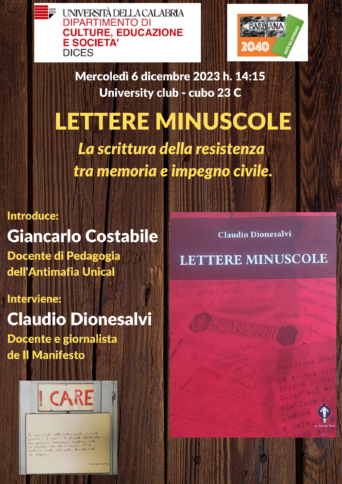 RENDE Nuova iniziativa dell’insegnamento universitario di Pedagogia dell’Antimafia attivo presso il dipartimento di Culture, Educazione e Società dell’Università della Calabria. Domani, mercoledì 6 dicembre, alle 14.15 presso l’University club, gli studenti e le studentesse di Scienze dell’Educazione dell’Unical incontreranno Claudio Dionesalvi, docente e giornalista de Il Manifesto, per discutere la sua ultima fatica letteraria “Lettere minuscole” e la scrittura della resistenza tra memoria e impegno civile. L’incontro si aprirà con l’introduzione di Giancarlo Costabile, titolare dell’insegnamento di antimafia. L’evento è patrocinato da Barbiana 2040, rete nazionale di scuole dedicata all’attualizzazione della metodologia didattica di don Milani. L’intellettuale cosentino sarà, infine, premiato per la sua attività pedagogica rivolta all’inclusione e alla costruzione delle idealità di eguaglianza proprie della Costituzione repubblicana.