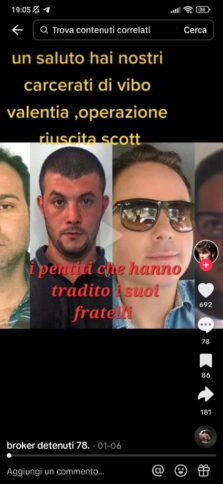 L’account è pieno di foto di detenuti, esponenti di clan di Vibo Valentia e della Calabria. Una sorta di album ‘ndranghetista in cui vengono collezionati gli esponenti più importanti “catturati” dalle forze dell’ordine. Tra le gallerie fotografiche spuntano diversi capibastone delle principali ‘ndrine calabresi, ma anche uomini ritenuti vicini ai clan della Puglia e della Sicilia. Un video di qualche mese fa, mostra le foto dei collaboratori di giustizia vibonesi: Andrea Mantella, Emanuele Mancuso, Bartolomeo Arena e Raffaele Moscato. Su di loro una scritta rossa: «i pentiti che hanno tradito i suoi (loro, ndr) fratelli». Subito dopo una carrellata di foto delle persone coinvolte nell’operazione Rinascita Scott di quattro anni fa. Nei commenti al video, che ha ottenuto quasi 700 like, messaggi di solidarietà nei confronti dei detenuti e insulti ai collaboratori di giustizia bollati come «uomini senza palle».