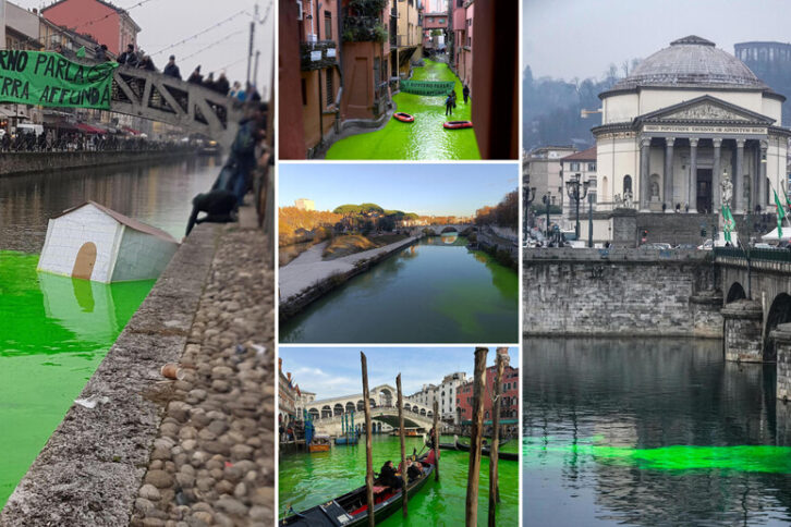 Uno degli ambientalisti ha preso il megafono e ha risposto: «Il governo italiano ha lanciato un allarme rosso contro tutti gli attivisti climatici. Ci chiamano eco vandali e sapete come reagiamo? Fregandocene e venendo qui a lanciare il vero allarme. Venezia sarà una delle prime città al mondo a pagare le condizioni climatiche». Sul Canal Grande la circolazione è stata bloccata e sul posto sono arrivati anche i sommozzatori dei vigili del fuoco per garantire la sicurezza durante la discesa dal ponte. Ventotto gli eco attivisti fermati e identificati per il blitz a Rialto e, fa sapere il Prefetto di Venezia Michele Di Bari, «non si esclude la possibilità di denuncia per interruzione di pubblico servizio». La presenza degli attivisti imbragati e sospesi dal ponte di Rialto ha infatti comportato lo stop della navigazione per un’ora e un quarto. A Milano a diventare verde sono stati i Navigli. Sul ponte Alda Merini è stata appesa la scritta “Il governo parla, la terra affonda”. Gli attivisti hanno anche inscenato una sorta di flash mob sdraiandosi a terra con addosso dei cartelli e hanno fatto affondare una casa di carta perché, hanno spiegato in una storia su Instagram, «stiamo letteralmente affondando». Anche il Tevere, a Roma, si è colorato di verde. Il blitz è avvenuto all’altezza dell’Isola Tiberina. «Respira e poi ribellati con noi», la scritta sui volantini distribuiti ai passanti incuriositi affacciati sui ponti che hanno scattato foto. A Bologna alcuni canotti sono stati rilasciati nel canale del Reno, noto come la “Piccola Venezia”, che passa in centro città e su cui si affaccia la famosa finestrella di via Piella, star di Instagram. Sulla riva del Guazzatoio, oggi aperta al pubblico, gli attivisti hanno atteso l’intervento delle forze dell’ordine con un piccolo presidio. L’ultima città ad essere stata presa di mira è Torino: una quindicina di attivisti ha raggiunto le rive del Po lungo i Murazzi e ha gettato la fluorescina per poi srotolare lo stesso striscione esposto a Milano dal ponte della Gran Madre. E anche qui gli attivisti hanno utilizzato una casetta di legno ancorata sul fiume, a rappresentare le conseguenze della crisi ecoclimatica. (Ansa)