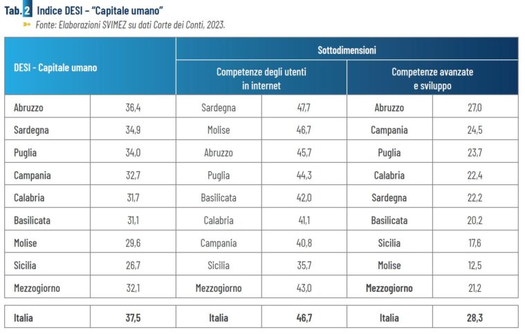 Stando all’ultimo rapporto Desi (Digital Economy and Society Index o Indice dell’Economia e della Società Digitale nella traduzione ufficiale italiana), la regione è tra le ultime in Italia per competenze del capitale umano. Nell’indice ottiene infatti 31,7 punti contro la media nazionale del 37,5 e di 32,1 degli altri territori del Meridione.