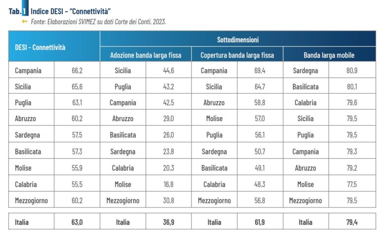 In particolare osservando le sottodimensioni legate alla connettività alla rete internet, emerge che per adozione alla banda larga fissa, la regione con 20,3 punti è penultima, preceduta solo dal Molise (16,8 punti). Sotto questo profilo la media nazionale sale a 36,9 e il Sud a 30,8.