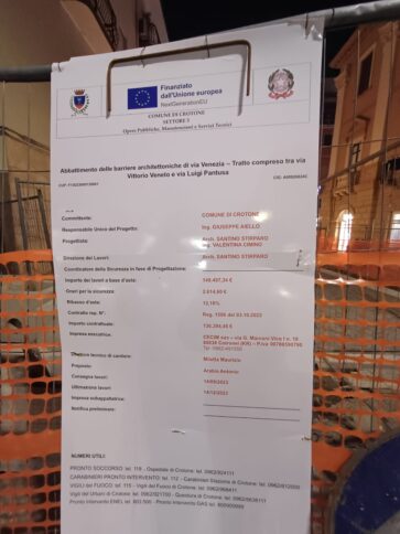 L’opera, in fase di realizzazione, aveva ottenuto un finanziamento nell’ambito di Visit Crotone. Il Comune pitagorica ha partecipato ad un bando ed ha ottenuto un finanziamento di circa 150.000 euro per realizzare un’opera in via Venezia. Il bando è riservato alle città interessate dalle attività crocieristiche e il progetto finanziato prevedeva appunto la realizzazione di un’opera di arredo urbano al centro della strada, proprio a ridosso di corso Vittorio Veneto con vista sul palazzo comunale. I lavori prevedono la realizzazione, intorno alla fioriera, di un lastricato di sampietrini. Prima, però, occorreva togliere le basole che sono state allocate all’inizio del 1900, quando l’assetto viario del centro città è stato realizzato con questi materiali.