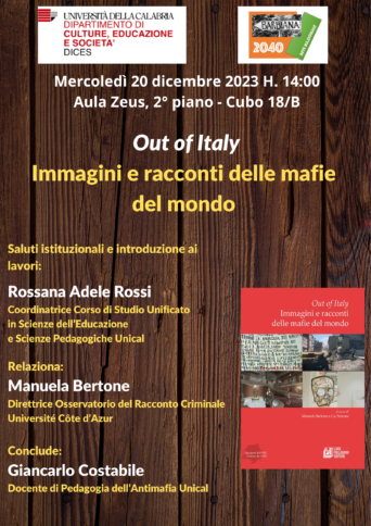 COSENZA Le immagini e i racconti delle mafie del mondo al centro del nuovo appuntamento seminariale di Pedagogia dell’Antimafia, corso universitario attivo presso il Dipartimento di Culture, Educazione e Società dell’Università della Calabria. Domani, mercoledì 20 dicembre, alle 14.00 presso l’aula Zeus (secondo piano, cubo 18/B), gli studenti e le studentesse di Scienze dell’Educazione dell’Unical dialogheranno con Manuela Bertone (collegata da remoto), Direttrice dell’Osservatorio del Racconto Criminale dell’Université Côte d’Azur dove è professoressa ordinaria di Studi italianistici. La manifestazione prevede i saluti istituzionali e l’introduzione ai lavori della Coordinatrice del Corso di Studio Unificato in Scienze dell’Educazione e Scienze Pedagogiche, Rossana Adele Rossi, docente di Pedagogia sociale, e le conclusioni di Giancarlo Costabile, docente di Pedagogia dell’Antimafia. L’evento è patrocinato da Barbiana 2040, rete nazionale di scuole dedicata all’attualizzazione della metodologia didattica di don Milani. Nel corso dell’incontro, sarà presentato il volume Out of Italy. Immagini e racconti delle mafie del mondo, edito da Pellegrini, il primo della collana «Quaderni dell’ORC», che intende proporre alla lettura su base annuale gli esiti degli studi condotti collettivamente dai ricercatori afferenti alla struttura.