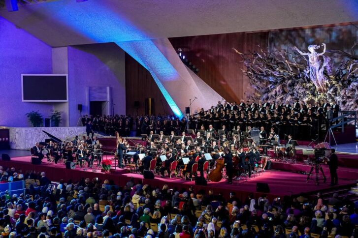 Evento nato nel 2015 da un’idea di Riccardo Rossi e Gualtiero Ventura, organizzato da Nova Opera con la Direzione Artistica del M° Mons. Marco Frisina. Questo straordinario concerto ha ricevuto la Benedizione di Papa Francesco, concedendo la possibilità di eseguirlo nell’Aula Paolo VI. Per l’edizione del 2023 la direzione è stata affidata alla Direttrice d’Orchestra Speranza Scappucci, che si è alternata sul podio con il M° Mons. Frisina, per guidare l’Orchestra e il Coro del Teatro dell’Opera di Roma. Ospiti d’onore sono stati, dunque i circa 3000 meno fortunati, compresi i senza fissa dimora, i migranti e coloro che vivono situazioni di disagio sociale, invitati a partecipare attraverso il Dicastero per il Servizio della Carità e le numerose associazioni di volontariato che li assistono quotidianamente. Nella mattinata del 15 dicembre, in Udienza Privata, nella Sala Clementina Papa Francesco ha ricevuto i sostenitori dell’evento. Nel saluto ha accolto i partecipanti dicendo: “È più facile fare armonia con le note che con le persone…, ma non è il vostro caso! Voi siete stati capaci di fare armonia tra voi!”. Concludendo, poi, ha invitato tutti affermando: “Non basta la musica, non bastano le luci, gli addobbi, no, ci vuole la preghiera”, affidando l’iniziativa a tutti i partecipanti all’intercessione di Maria.