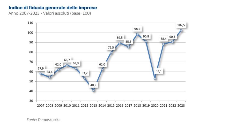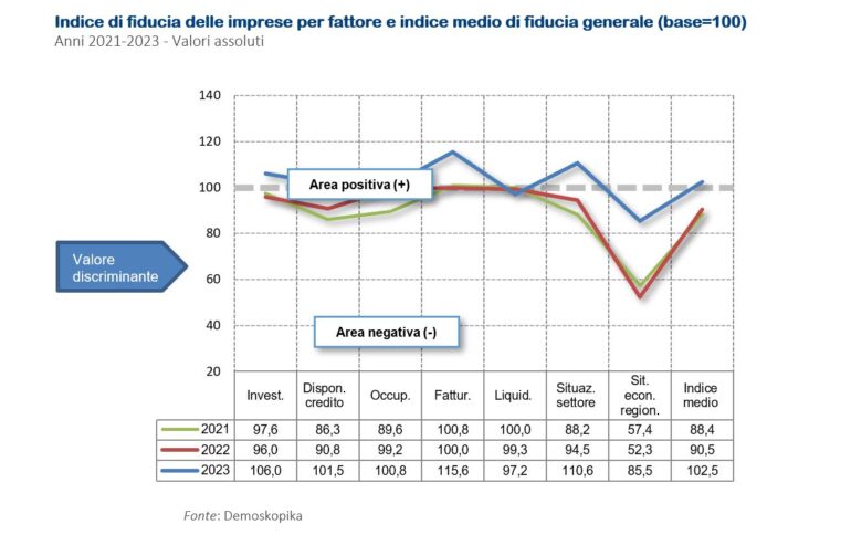 «Se dovesse persistere la tendenza “rialzista”, anche nel 2024 l’indice di fiducia dovrebbe proseguire la sua crescita. Tirando le somme, per il 2023 aumenta al 27,7% (dal 13,5% del 2022) la quota degli operatori economici che prevede una ripresa mentre resta più stabile salendo di poco al 25,2% (23% nel 2023) la quota degli imprenditori “pessimisti” che prevedono una recessione dell’economia. Entrando nel dettaglio dei singoli indicatori, solo alcuni consolidano la ripresa dell’anno precedente, altri restano quasi stabili e altri ancora in leggero calo. In area positiva si collocano fatturato (+15,6 punti), investimenti (+10,0 punti), disponibilità di credito (10,7 punti). In area negativa, al contrario, si posiziona l’andamento della liquidità (-2,1 punti). Più stabili le previsioni su una ripresa dei livelli occupazionali a quota 100,8 che registrano un leggero miglioramento (+1,6 punti). L’indice riguardo le aspettative dell’economia regionale, infine, continua a rappresentare il fattore più critico collocandosi ancora in area negativa, tuttavia nell’ultimo anno, dopo la discesa del 2022 (-5,1 punti), fa registrare un notevole miglioramento con un rialzo di ben 33,2 punti attestandosi al valore più elevato della serie storica, passando da 52,3 a 85,5 punti».