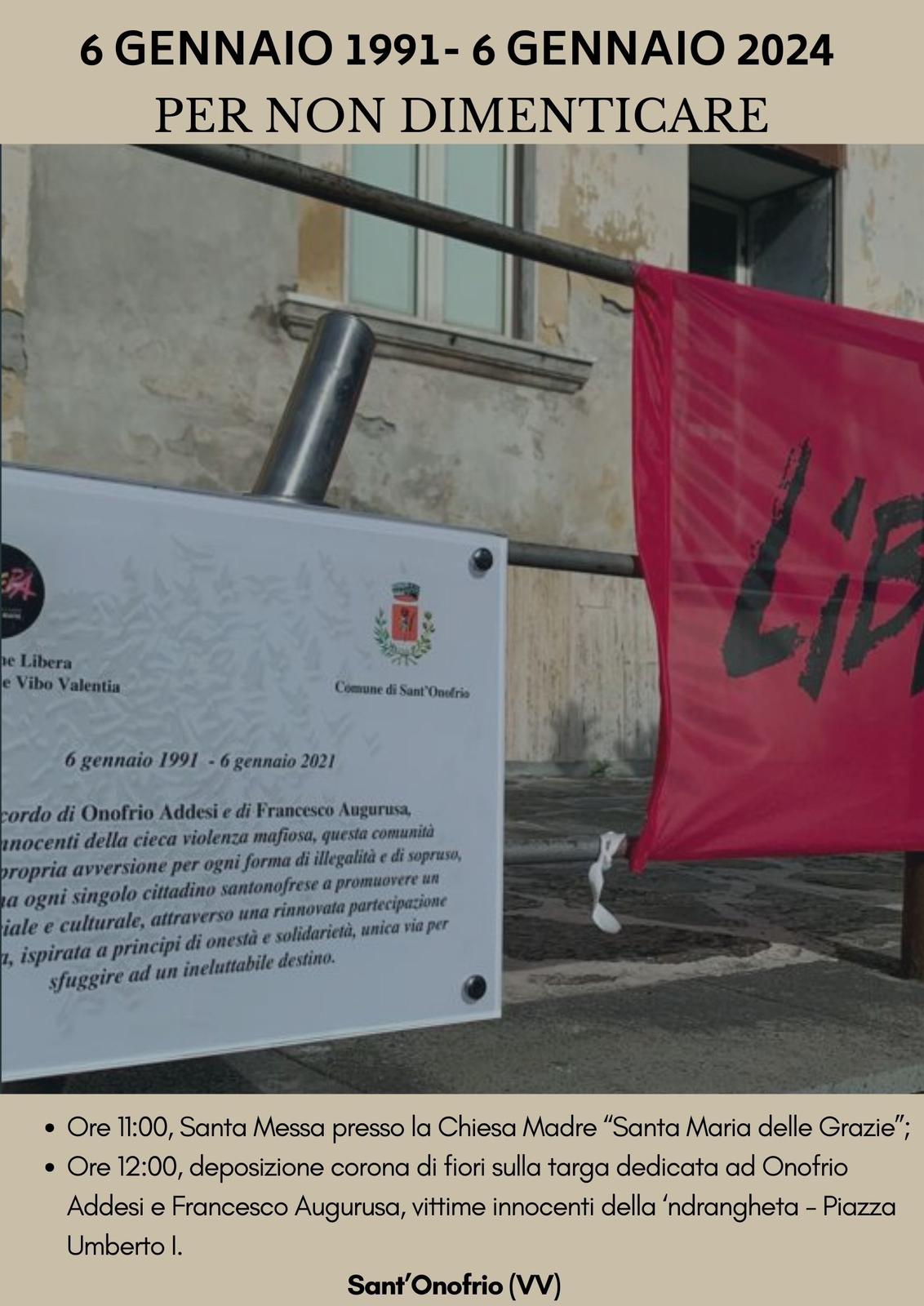 VIBO VALENTIA «Sabato 6 gennaio 2024 ricorderemo Onofrio Addesi e Francesco Augurusa, vittime innocenti della ‘ndrangheta caduti durante la terribile mattanza conosciuta come la “Strage della Befana”. Ci ritroveremo per le celebrazione della Santa Messa in loro suffragio nella Chiesa Madre “Santa Maria delle Grazie” di Sant’Onofrio alle ore 11:00 e, subito dopo, nella Pizza Umberto I per deporre una corona di fiori sulla targa a loro dedicata. Un momento di raccoglimento e di preghiera nel ricordo di due uomini che nulla avevano a che fare con le dinamiche criminali e che purtroppo, rimasero vittime del fuoco incrociato che, in quei tempi, insanguinava la città a causa di una guerra per il controllo del territorio da parte di due ‘ndrine rivali, i Bonavota da un lato, veri destinatari dell’agguato del 6 gennaio, e i Petrolo-Matina-Bartolotta dall’altro. Nella piazza teatro di quella violenza inaudita che ha segnato un’intera comunità, ora predomina, invece, il ricordo di due uomini buoni la cui memoria deve essere monito per il risveglio delle coscienze e per incanalare positivamente ogni energia di impegno e partecipazione per il riscatto di un intero territorio». E’ quanto si legge in una nota del Coordinamento provinciale di Libera Vibo Valentia.
