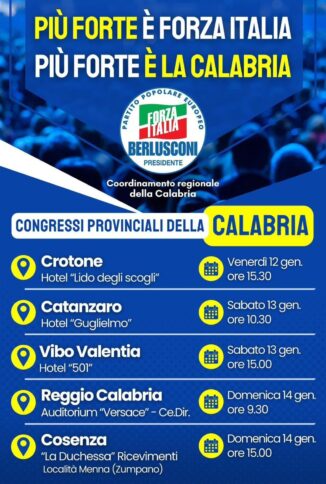 Crotone, venerdì 12 gennaio, Catanzaro, sabato 13 gennaio, Vibo Valentia, sabato 13 gennaio, Reggio Calabria, domenica 14 gennaio, Cosenza, domenica 14 gennaio a Zumpano. A Crotone in lizza per la carica di segretario provinciale ci sono il coordinatore provinciale uscente e già parlamentare Sergio Torromino, in netto vantaggio sul piano del tesseramento, e il presidente della Provincia Sergio Ferrari; a Catanzaro si profila l’elezione del consigliere comunale Marco Polimeni, coordinatore Fi nel capoluogo; a Vibo quella del capogruppo regionale Michele Comito; a Cosenza quella dell’assessore regionale Gianluca Gallo e a Reggio prevedibilmente Cannizzaro manterrà temporaneamente l’incarico. (a. c.)