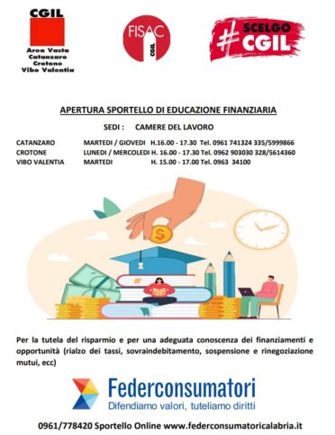 CATANZARO Nasce lo Sportello di Educazione Finanziaria. A darne notizia la Cgil Area vasta Catanzaro-Crotone-Vibo Valentia, la Fisac Cgil in collaborazione con la Federconsumatori Calabria. Questo servizio sarà attivo presso le sedi delle Camere del Lavoro della CGIL situate nelle sedi Catanzaro, Crotone e Vibo Valentia. Lo Sportello di Educazione Finanziaria è stato ideato con l’obiettivo di offrire ai cittadini un percorso di consapevolezza sui bisogni presenti (gestione dei consumi e indebitamento) e futuri (obiettivi di vita, pensione, protezione). Il servizio si propone di favorire comportamenti responsabili orientati alla messa in sicurezza del bilancio familiare. L’obiettivo principale dello sportello è di aiutare le persone e le famiglie a gestire al meglio le risorse di oggi e a programmare il proprio futuro, nonché quello dei propri figli. Ciò sarà possibile grazie a una consulenza professionale fornita da educatori finanziari qualificati, esperti del settore, che accompagneranno e supporteranno i cittadini nell’individuare e pianificare la realizzazione dei propri obiettivi di vita. Tra questi, rientrano l’acquisto della casa, l’istruzione universitaria per i figli, la costruzione di una pensione adeguata, e altro ancora. L’iniziativa rappresenta un importante passo verso la promozione di una maggiore consapevolezza finanziaria all’interno della comunità: i cittadini interessati possono usufruire di questo servizio gratuito, in modo da acquisire le competenze necessarie per una gestione finanziaria responsabile e orientata al futuro. Per ulteriori informazioni, è possibile contattare direttamente le Camere del Lavoro della CGIL nelle sedi di Catanzaro, Crotone e Vibo Valentia.