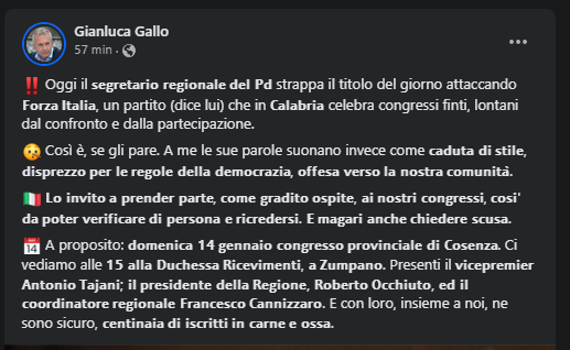 COSENZA «Oggi il segretario regionale del Pd strappa il titolo del giorno attaccando Forza Italia, un partito (dice lui) che in Calabria celebra congressi finti, lontani dal confronto e dalla partecipazione. Così è, se gli pare. A me le sue parole suonano invece come caduta di stile, disprezzo per le regole della democrazia, offesa verso la nostra comunità. Lo invito a prender parte, come gradito ospite, ai nostri congressi, così da poter verificare di persona e ricredersi. E magari anche chiedere scusa». Cosi su Facebook l’assessore regionale all’Agricoltura, Gianluca Gallo, coordinatore provinciale di Forza Italia Cosenza, con riferimento a quanto dichiarato dal segretario regionale4 del Pd Nicola Irto in una intervista al Corriere della Calabria (leggi qui).