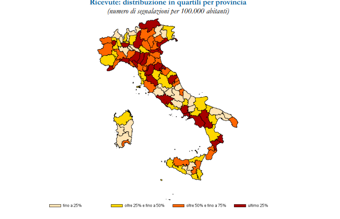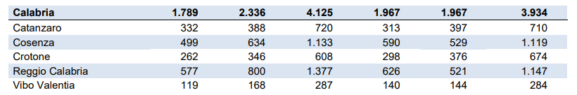 In Calabria sono 3.934 le segnalazioni definite “sospette” (nel periodo luglio-dicembre 2023) ma i numeri maggiori, in particolare, sono stati registrati in due province, quella di Cosenza e Reggio Calabria, rispettivamente 1.119 e 1.147. Segue la provincia di Catanzaro con 710, Crotone con 674 e Vibo Valentia con 284. Nel dettaglio delle performance regionali, spicca la Lombardia con 27.462 SOS nel 2023 (-0,68% sul 2022, con la provincia di Milano che, da sola, arriva a 15.282 SOS, in lieve crescita sull’anno precedente) seguita da Campania e Lazio che sfiorano, entrambe, le 16.000 SOS annue e fanno registrare, però, un calo più marcato sul 2022 (rispettivamente -13,1% e -17,5%).