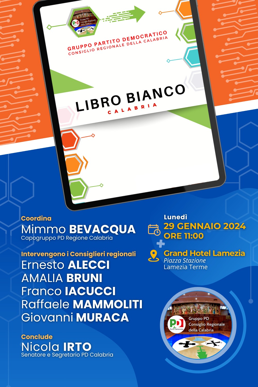 LAMEZIA TERME Sarà presentato lunedì 29 gennaio al Grand Hotel Lamezia, con inizio alle ore 11.00, il Libro Bianco elaborato dal gruppo del Pd in Consiglio regionale.