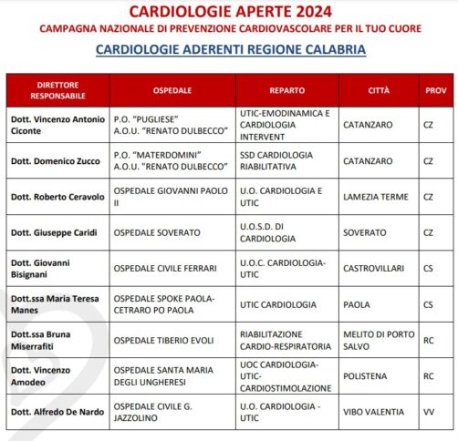 COSENZA Le malattie cardiovascolari restano la prima causa di morte in Italia e nel mondo, la prevenzione è la prima arma per combatterle e anche quest’anno la Fondazione per il Tuo cuore dei Cardiologi Ospedalieri Italiani ANMCO dal 12 febbraio al 18 febbraio, in occasione di San Valentino, lancia l’iniziativa nazionale di prevenzione cardiovascolare “Cardiologie Aperte 2024”, giunta alla sua diciottesima edizione. Durante l’intera settimana la Fondazione attiverà un numero verde dedicato ai cittadini che potranno chiamare gratuitamente tutti i gratuitamente per porre domande sui problemi legati alle malattie del cuore, alle quali risponderanno 600 cardiologi ANMCO delle Strutture aderenti all’iniziativa, con 1300 ore di consulenza cardiologica gratuita. L’iniziativa tornerà a svolgersi anche in presenza e in alcune cardiologie si eseguiranno gratuitamente screening cardiologici personalizzati e/o dibattiti ed eventi di formazione sulle diverse tematiche. Sul sito della Fondazione sarà pubblicato il calendario delle attività previste con i giorni e orari di risposta telefonica oltre alle iniziative in presenza sull’intero territorio.