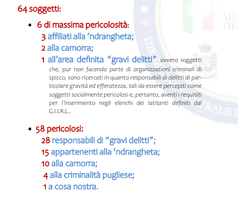 Sono, allo stato, presenti 3 soggetti: uno di camorra, Renato Cinquegranella; un responsabile del reato di “sequestro di persona”, Attilio Cubeddu e uno di Cosa Nostra, Giovanni Motisi. La sinergica attività operativa delle Forze di polizia che operano all’interno del G.I.I.R.L. ha consentito di catturare, dal 2019 ad oggi, 7 latitanti inseriti nell’ “Elenco dei latitanti di massima pericolosità del Programma Speciale di Ricerca”. Tre appartengono alla ‘ndrangheta: Pelle Francesco, Morabito Rocco e Bonavota Pasquale; due alla Camorra: Marco Di Lauro e Raffaele Imperiale; uno di Cosa nostra: Matteo Messina Denaro e un responsabile di “gravi delitti”: Graziano Mesina.
