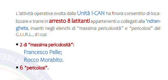 L’impegno dello Stato nella ricerca e cattura dei latitanti è testimoniato, anche a livello internazionale, dal progetto I-CAN “Interpol Cooperation against ’ndrangheta”, che ha lo scopo di accrescere la cooperazione tra le Polizie di vari Paesi per concorrere a disarticolare le ramificazioni globali della minaccia criminale costituita dalla ‘ndrangheta. L’attività operativa svolta dalla Unità I-CAN ha finora consentito di localizzare e trarre in arresto 8 latitanti appartenenti o collegati alla ‘ndrangheta, inseriti negli elenchi di “massima pericolosità” e “pericolosi” del G.I.I.R.L., di cui due di “massima pericolosità”: Francesco Pelle e Rocco Morabito e sei “pericolosi”.
