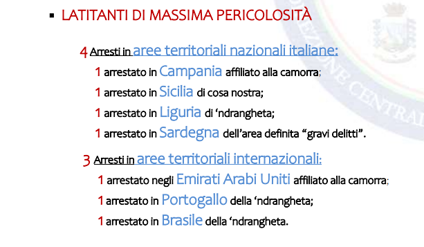 Attualmente, di seguito agli arresti eseguiti, rispettivamente, il 16 gennaio e il 27 aprile 2023 degli esponenti di spicco di Cosa Nostra, Matteo Messina Denaro, e di ‘Ndrangheta, Pasquale Bonavota. Nell’“Elenco dei latitanti di massima pericolosità del Programma Speciale di Ricerca” sono presenti 3 soggetti mentre per quanto riguarda i latitanti inseriti nell’ “Elenco dei latitanti pericolosi”, allo stato, sono presenti 56 soggetti. Tra questi figurano 8 donne, indagate o condannate per reati associativi in materia di criminalità mafiosa, traffico di sostanze stupefacenti, sfruttamento della prostituzione e per altri gravi delitti.