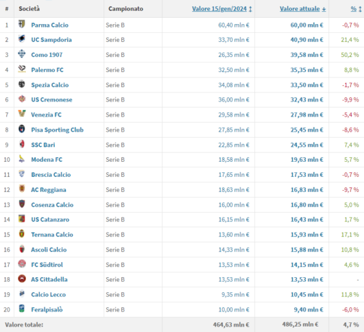Le rose di Cosenza e Catanzaro si equivalgono. È quanto emerge dalla classifica stilata dal sito Transfermarkt.it che dopo la conclusione del calciomercato invernale, ha fornito la propria stima del valore degli organici delle società partecipanti al campionato di serie B. La classifica è guidata dalla capolista Parma con un valore della rosa di 69 milioni di euro. Seguono la Sampdoria con 40,90 e il Como che da un valore di 26,35 del 15 gennaio scorso, è passato a 39,58 milioni.