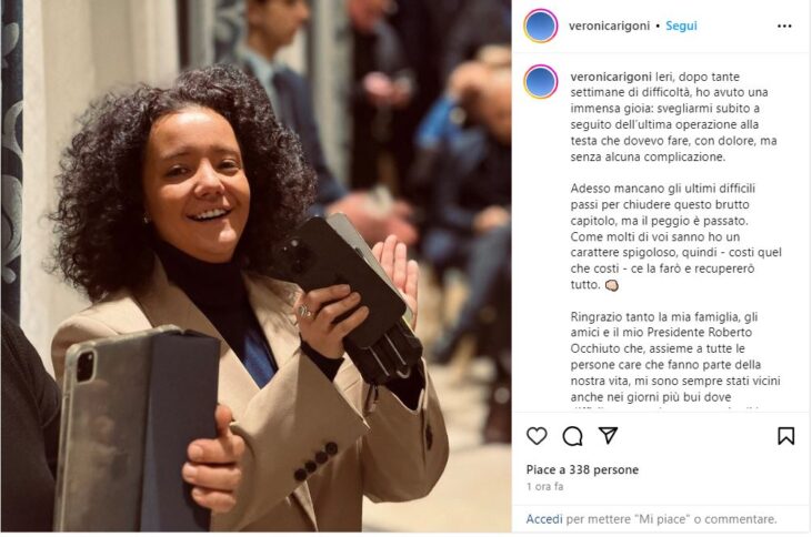VICENZA «Ieri, dopo tante settimane di difficoltà, ho avuto una immensa gioia: svegliarmi subito a seguito dell’ultima operazione alla testa che dovevo fare, con dolore, ma senza alcuna complicazione. Adesso mancano gli ultimi difficili passi per chiudere questo brutto capitolo, ma il peggio è passato». Così in un post su Instagram Veronica Rigoni, la giovane assistente del presidente della Regione Calabria, Roberto Occhiuto, rimasta coinvolta il 14 gennaio in un incidente sull’autostrada A2 informa sul suo stato di salute. Dopo aver lasciato l’ospedale di Catanzaro, dove era ricoverata in seguito all’incidente, Rigorni era stata trasferita in Veneto per effettuare un delicato intervento.