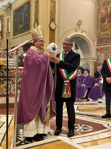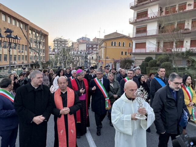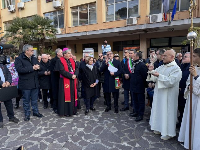 CASSANO ALLO IONIO Sono arrivate in città le reliquie del beato don Pino Puglisi, prete antimafia ucciso da cosa nostra proprio per il suo impegno contro il malaffare. L’amministrazione comunale di Cassano, col sindaco Giovanni Papasso, e la Diocesi di Cassano All’Jonio, guidata dal vescovo e vice presidente Cei monsignor Francesco Savino, hanno accolto con vivo piacere la proposta dell’associazione di aprire la peregrinatio della reliquia del beato Pino Puglisi, unica tappa in Calabria, a Cassano dal 17 al 19 febbraio. L’evento è stato organizzato, nell’ambito dell’anno sinodale voluto da Papa Francesco, dall’associazione “Città del Santissimo Crocifisso”. Alla cerimonia erano presenti il sindaco Giovanni Papasso, il presidente del consiglio Lino Notaristefano, il vicesindaco Antonino Mungo, l’assessore Elisa Fasanella, la consigliera con delega Carmen Gaudiano, i consiglieri Luigi Malomo, Giuseppe Graziadio, Pino Praino, dipendenti e dirigenti comunali, con in testa la comandante della Polizia Locale architetto Anna Maria Aiello, oltre a tantissimi referenti dell’associazione delle Città del Santissimo Crocifisso con in testa il vicepresidente Luigi Iuppa, sindaco di Geraci Siculo, e il segretario Giuseppe Semeraro. Presente anche l’ex ministro Maria Carmela Lanzetta, tantissimi studenti e cittadini accorsi per partecipare all’evento, e altri rappresentanti del mondo religioso, delle forze dell’ordine, politico-amministrativo e dell’associazionismo.